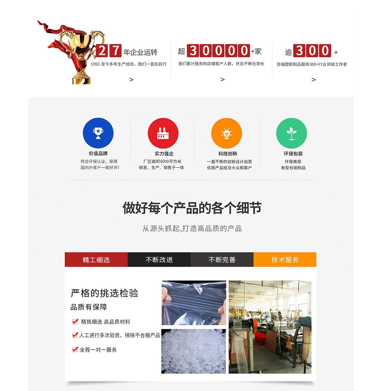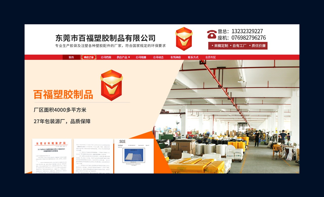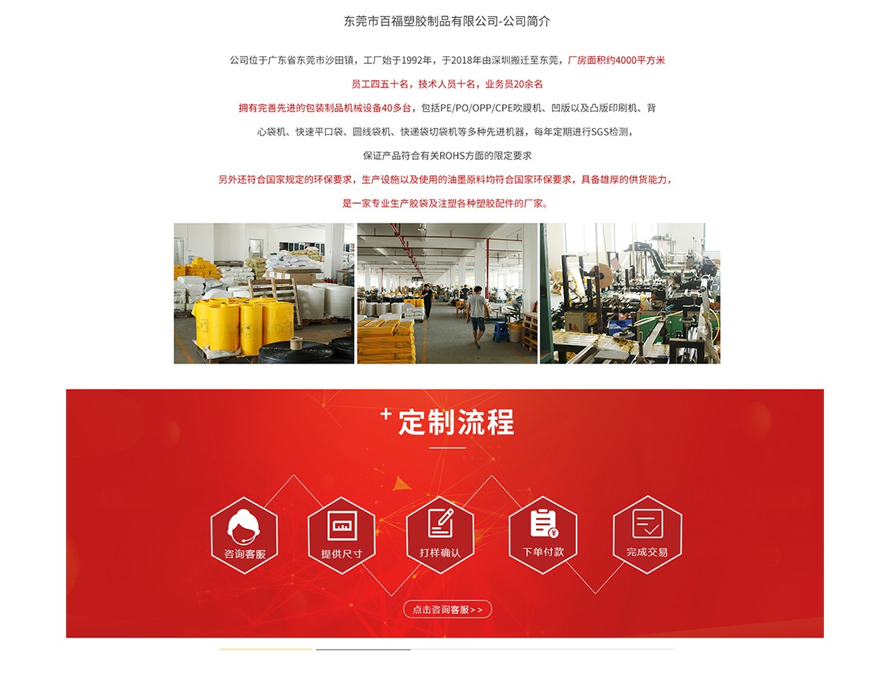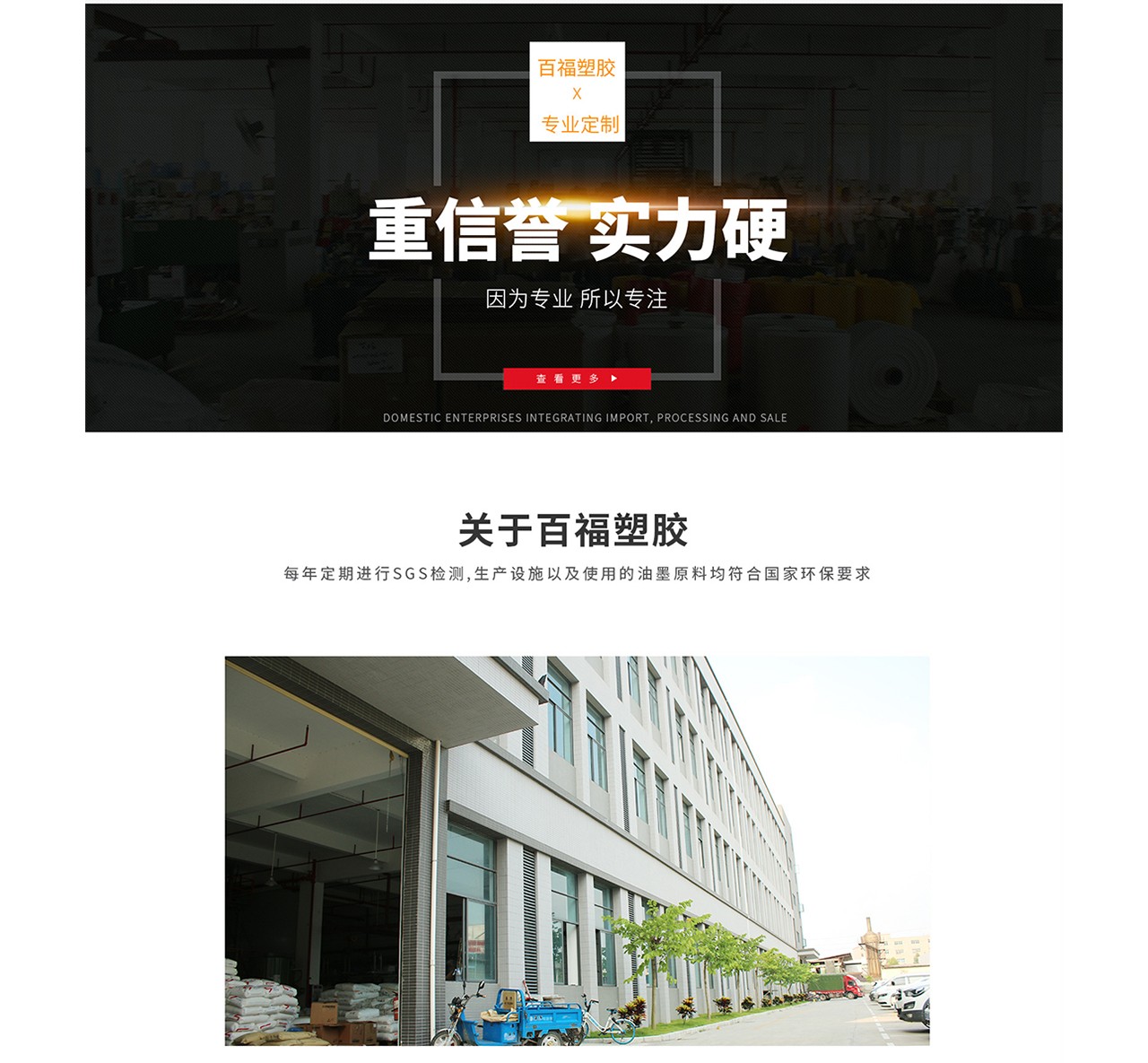 東莞市百福塑膠制品有限公司位于廣東省東莞市沙田鎮(zhèn),工廠始于1992年,于2018年由深圳搬遷至東莞,廠房面積約4000平方米,擁有完善先進的包裝制品機械設備,每年定期進行SGS檢測,保證產(chǎn)品符合有關ROHS方面的限定要求。擁有先進的相關設備40多臺,具備雄厚的供貨能力,是一家專業(yè)生產(chǎn)膠袋及注塑各種塑膠配件的廠家。 經(jīng)營范圍:主營產(chǎn)品有:PE墊圈,PO墊圈,PE防靜電袋等。PE、PO、PP、OPP、卡頭袋、拉伸膜、環(huán)保袋。禮品袋,卡頭袋,膠粘袋,信封袋,購物袋,背心袋,手挽袋,四方袋,叉耳袋,防靜電袋,POF,收縮膜,物流袋,連格袋,自封袋,骨袋,風琴袋,服裝袋,平掛袋,斜掛袋等系列工業(yè)用膠袋。
